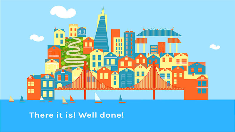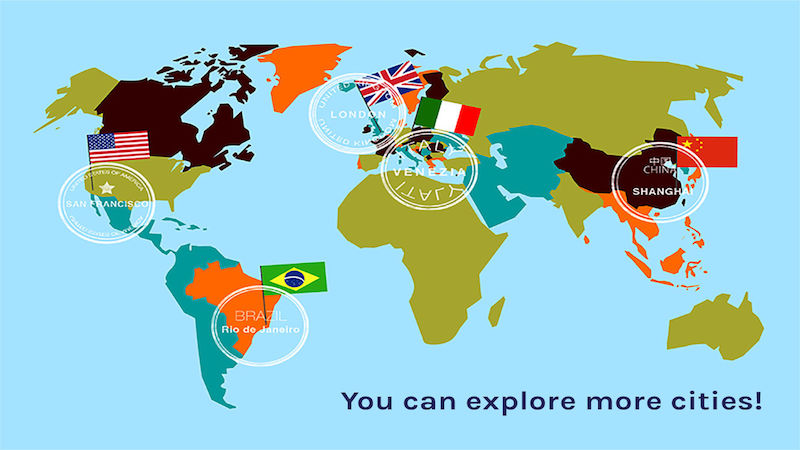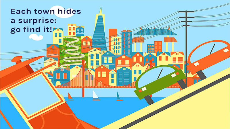 We have chosen five wonderful cities of the world to discover and explore. Putting the different skylines back together like a simple puzzle, young and old will find themselves in Venice, London, Shanghai, San Francisco and Rio de Janeiro. Each city comes alive and, looking well, reveals small animations, sounds, real noises and … some secrets.